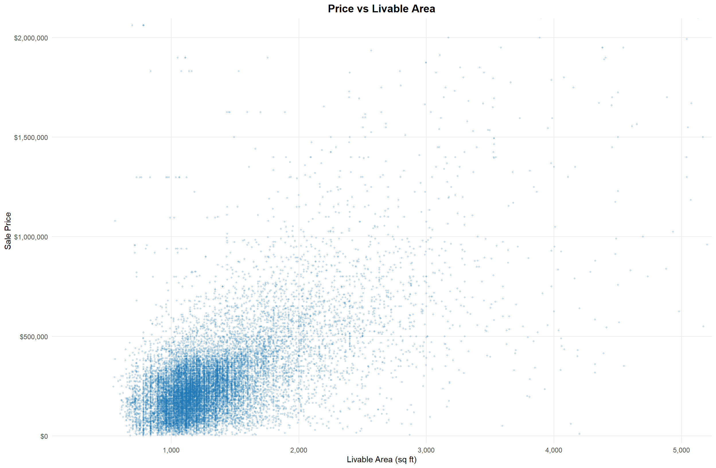 The final model performs best with an R² of 0.771, which means that this model explains about 77% of the variation in home prices. The predicted price is usually about $97,500 away from the actual sale price, which is about a 28% improvement over the baseline structural model.